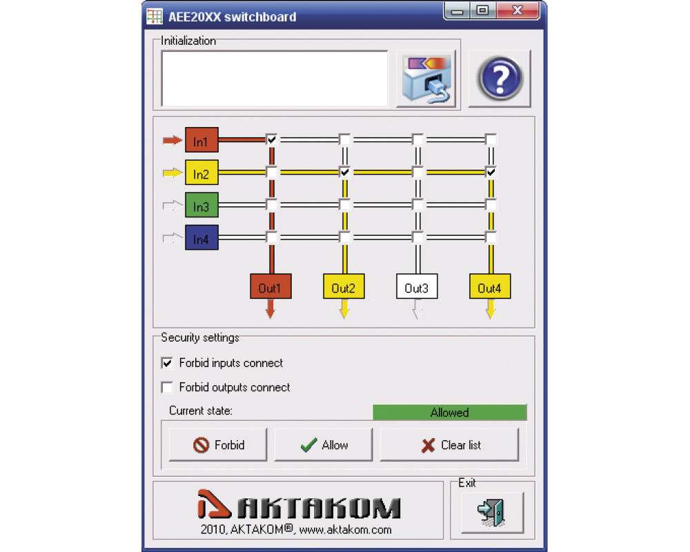 Прибор АЕЕ-2088 является матричным коммутатором сигналов с электронным управлением. Матрица коммутации имеет 4 входа и 4 выхода и обеспечивает возможности коммутации 1 любого входа на 7 выходов. Выполнен в виде приставки к компьютеру (ПК). Управление коммутацией осуществляется программно от компьютера через интерфейс USB или дистанционно через сет..