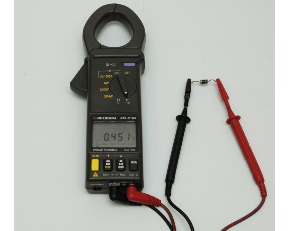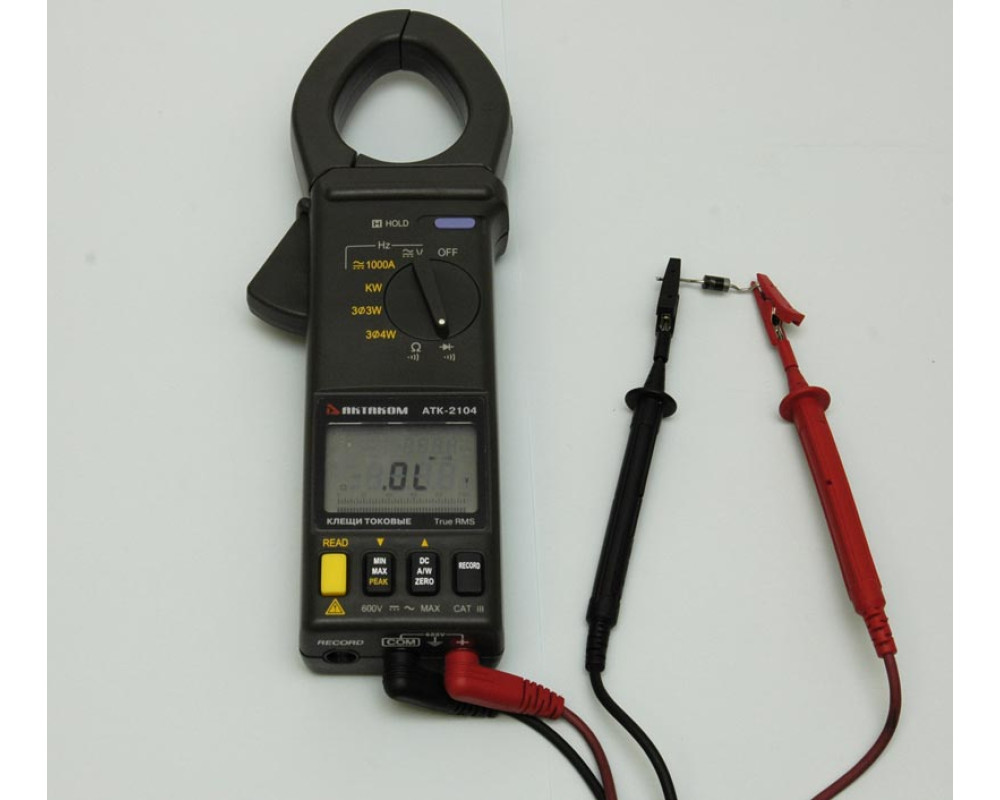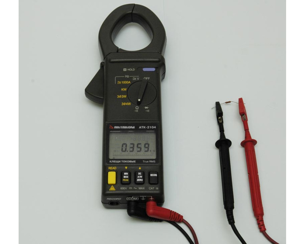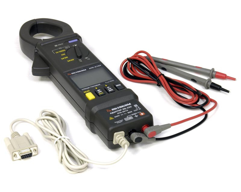 Токовые клещи-ваттметр. Измерение активной, реактивной и полной мощности в одно- и трех-фазных сетях, постоянного и переменного (45...500 Гц) тока (0,1...1000 А), постоянного (0,1...600 В) и переменного напряжения (0,1...600 В), cos (φ), сопротивления (1 Ом...10 кОм), частоты (0,1 Гц...5 кГц). True RMS. Фиксация значений, диаметр до 46 мм. Базовая погрешность 0,5%. Графическая шкала, двойной ЖКИ. Габариты 260х93х45 мм. Вес 450 г. RS-232.