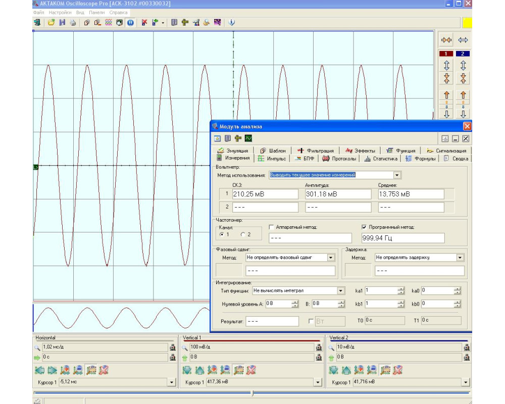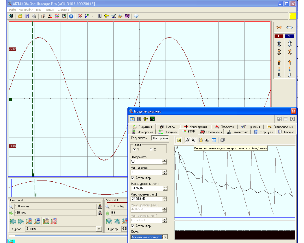4-х канальный USB осциллограф - приставка к ПК., 100 МГц, дискретизация 8 бит/ 100 MS/s-10 GS/s, коэфф. отклонен. 2 мВ/дел - 10 В/дел., коэф. развертки 0,01 мкс/дел - 100 ч/дел., макс. вх. напряжение ±100 В, входы 1 МОм/50 Ом, режим самописца, анализатор спектра, цифровая фильтрация, вх. внешн. синхронизации, калибратор, USB 1.1.; ПО для Windows XP, Windows 7, Windows 8, Windows 8.1, Windows 10, пит. 220 В, габариты 260х210х70 мм, масса 0,96кг.
