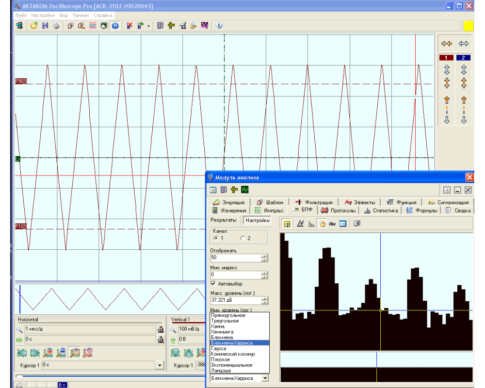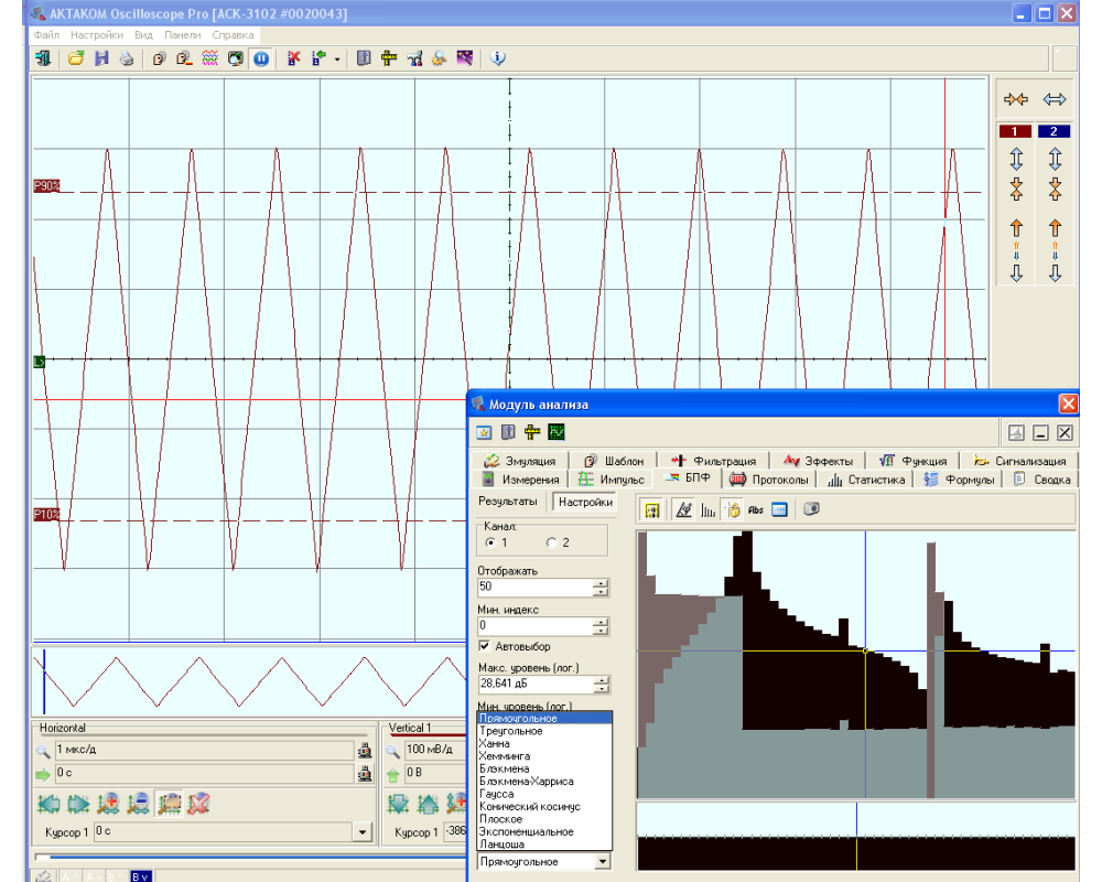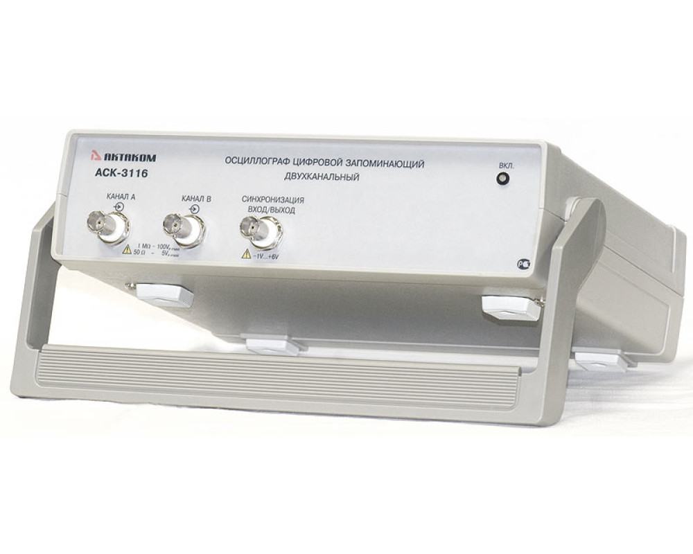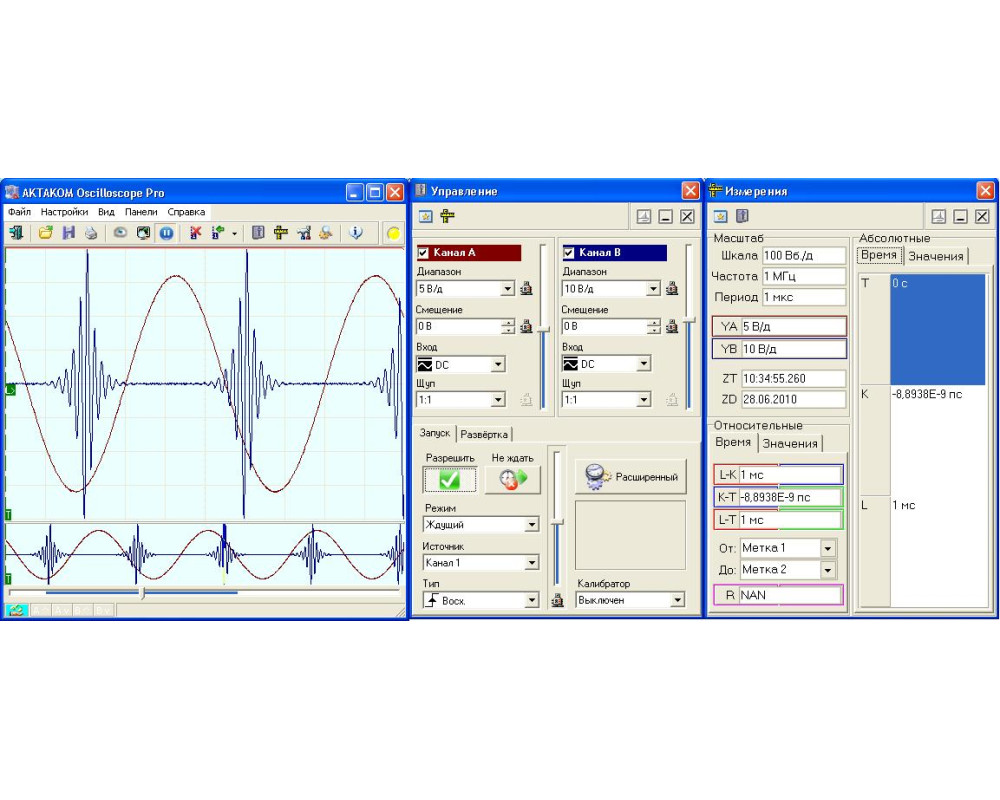 2-х канальный USB осциллограф - внешняя приставка к ПК,100 МГц, дискретизация 8 бит/ 100 MS/s-10 GS/s, коэфф. отклонен. 2 мВ/дел - 10 В/дел., коэф. развертки 0,01 мкс/дел - 100 ч/дел., макс. вх. напряжение ±100 В, входы 1 МОм/50 Ом, режим самописца, анализатор спектра, цифровая фильтрация, вх. внешн. синхронизации, калибратор,