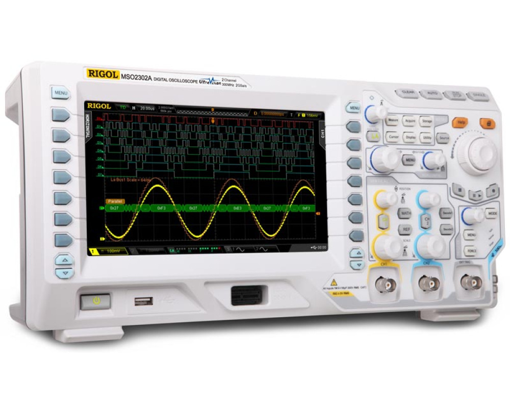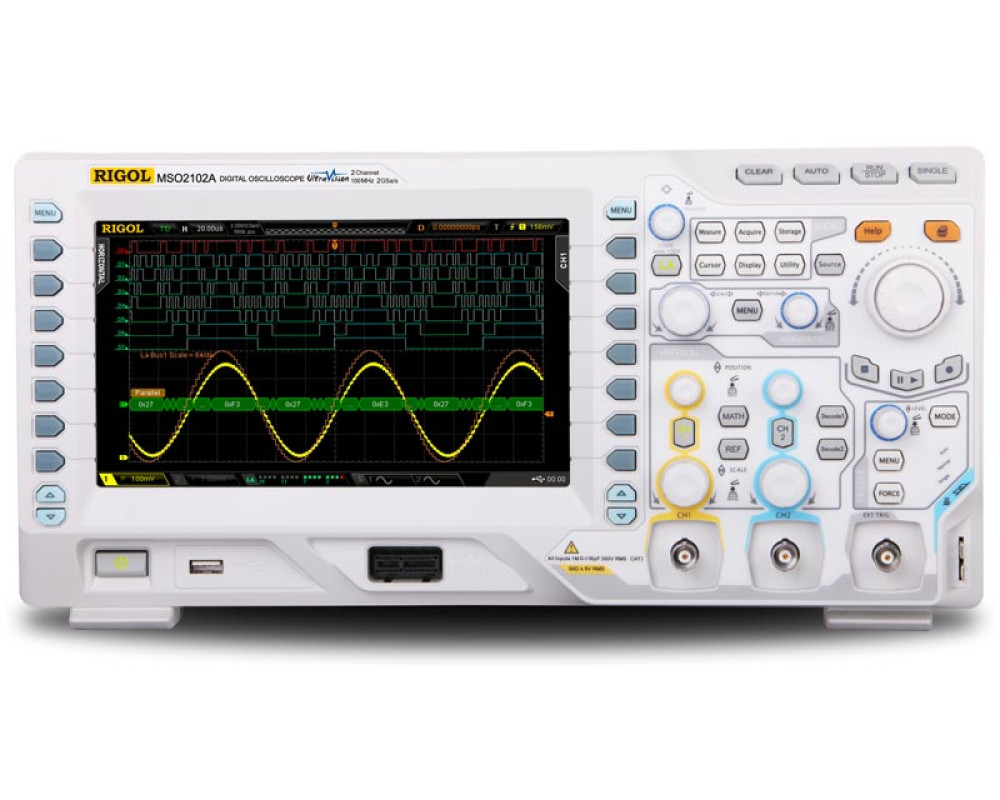 Цифровой осциллограф смешанных сигналов со встроенным генератором: 2 аналоговых канала + 16 цифровых. Осциллограф: полоса пропускания - 100 МГц; частота дискретизации - 2 Гвыб/с (1 Гвыб/с на канал). Макс. память - 14 М (7 М на каждый канал), 56 M (28 М) - опция; входной импеданс: 1 МОм, 50 Ом; скорость захвата 50000 осц/сек; 256 градаций яркости; расширенная синхронизация в т.ч. протоколы I2C, RS232, SPI, USB. UltraVision; курсорные измерения. 24 автоизмерения; матем. функции; БПФ;. интерполятор: линейный, Sin(x)/x; усреднение; пиковый детектор (500 пс); покадровый регистратор (65000 кадров); самописец; тестирование в пределах Pass/Fail. Логич.анализатор: 1 Гвыб/сек, 28 М точек 50000 осц /сек. Генератор сигналов: 2 канала, Полоса 0,1 Гц...25 МГц; 14 бит; 6 стандартных, 7 встроенных + произв.форма. глубина до 16 К точек, дискрет. 200 Мвыб/с; амплитуда 20 мВ...5 Впп. Выход синхронизации. Интерфейс: USB-host, USB-device, LAN. Дисплей: 20 см (8"), цветной, TFT, 800 х 480. Вес: 3,9 кг. Габаритные размеры: 361,6 x 179,6 x 130.8 мм.