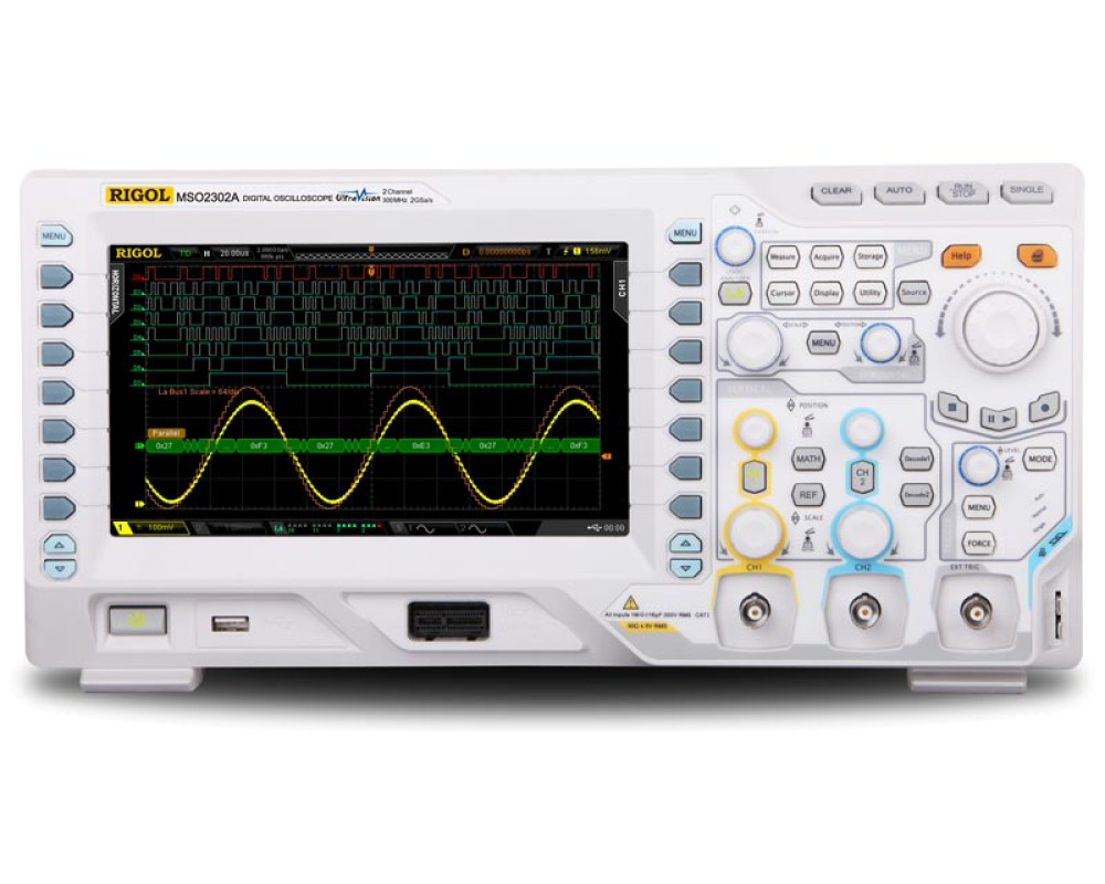 Цифровой осциллограф смешанных сигналов со встроенным генератором: 2 аналоговых канала + 16 цифровых. Осциллограф: полоса пропускания - 300 МГц; частота дискретизации - 2 Гвыб/с (1 Гвыб/с на канал). Макс. память - 14 М (7 М на каждый канал), 56 M (28 М) - опция; входной импеданс: 1 МОм, 50 Ом; скорость захвата 50000 осц/сек; 256 градаций яркости; расширенная синхронизация в т.ч. протоколы I2C, RS232, SPI, USB. UltraVision; курсорные измерения. 24 автоизмерения; матем. функции; БПФ;. интерполятор: линейный, Sin(x)/x; усреднение; пиковый детектор (500 пс); покадровый регистратор (65000 кадров); самописец; тестирование в пределах Pass/Fail. Логич.анализатор: 1 Гвыб/сек, 28 М точек 50000 осц /сек. Генератор сигналов: 2 канала, Полоса 0,1 Гц...25 МГц; 14 бит; 6 стандартных, 7 встроенных + произв.форма. глубина до 16 К точек, дискрет. 200 Мвыб/с; амплитуда 20 мВ...5 Впп. Выход синхронизации. Интерфейс: USB-host, USB-device, LAN. Дисплей: 20 см (8"), цветной, TFT, 800 х 480. Вес: 3,9 кг. Габаритные размеры: 361,6 x 179,6 x 130.8 мм.