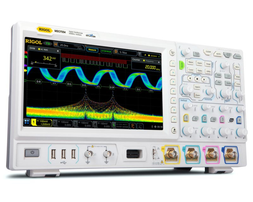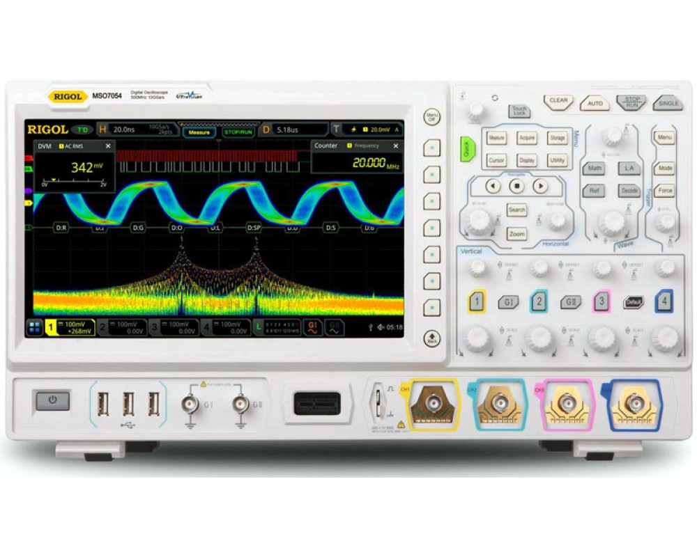 4 аналоговых и 16 цифровых каналов. Полоса пропускания (аналоговая) - 500 МГц. Технология UltraVision 2. Частота дискретизации - 10 Гвыб/с (5 Гвыб/с на 2 канала, 2,50 Гвыб/с - 4 канала). Макс. память - 100 М точек (500 М -опция). АЦП 8 бит. Скорость захвата 600000 осц./сек. Анализ осциллограмм (до 450000 кадров). Расширенная синхронизация (12 типов штатно), протоколы посл. шин (опция) I²C, RS-232, UART, SPI, CAN, FlexRay, LIN, I²S, и MIL-STD-1553. Декодирование протоколов (опц.). 41 тип автоизмерений. Матем. функции. Статистика. БПФ. Цифровой вольтметр. Частотомер. Генератор сигналов (2 канала, 25 МГц, опция). Интерфейс: USB-host, USB-device, LAN (c VNC Web), HDMI; GPIB (опция). Дисплей: 10,1", цветной, сенсорный, 1024 х 600. Вес: 3,9 кг. Размеры: 410 x 224 x 135 мм.