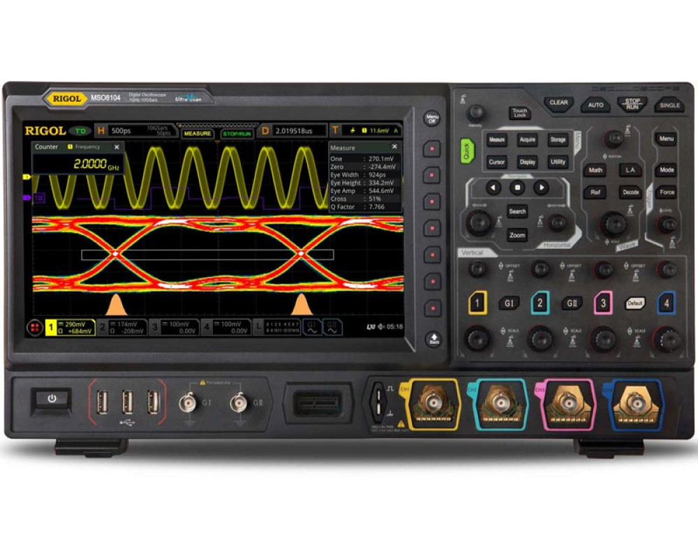 4 аналоговых канала + 16 цифровых (опция). Полоса пропускания - 1 ГГц (2 ГГц - опция). Технология UltraVision 2. Максимальная частота дискретизации - 10 Гвыб/с (5 Гвыб/с - два канала, 2,5 Гвыб/с каждый канал). Максимальная память - 500 М точек. АЦП 8 бит (12 бит - высокое разрешение). Скорость захвата 600000 осц./с. Анализ осциллограмм (до 450000 кадров). Расширенная синхронизация (12 типов штатно), протоколы последовательных шин (опция) I²C, RS-232, UART, SPI, CAN, FlexRay, LIN, I²S и MIL-STD-1553. Зональный запуск. Декодирование протоколов (опция). Анализ джиттера и глазковых осциллограмм (опция). 41 тип автоизмерений. Математические функции. Статистика. БПФ. Цифровой вольтметр. Частотомер. Встроенный генератор (опция). Интерфейс: USB-host, USB-device, LAN (c VNC Web, LXI-C), HDMI; GPIB (опция). Дисплей: 10,1", цветной, сенсорный, 1024 х 600. Вес: 4,0 кг. Размеры: 410 x 224 x 135 мм.
