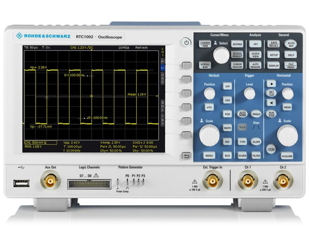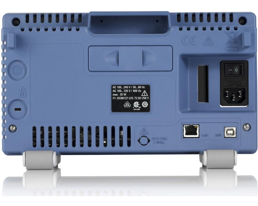 2 аналоговых канала. 8 цифровых каналов (опция RTC-B1). Полоса пропускания (аналоговые каналы) - 200 МГц; частота дискретизации - 2 Гвыб/с (1 Гвыб/с на канал); макс. память - 2 М (1 М на каждый канал); скорость захвата 10000 осц/сек; вертик. разрешение 8 бит (16 бит в режиме высокого разрешения); коэф. отклонения от 1 мВ/дел до 10 В/дел; входной импеданс: 1 МОм; развертка от 1 нс/дел до 100 с/дел. Стандартно 4 типа запуска, опционально I2C/SPI, UART/RS-232, CAN/LIN. Курсорные измерения. 31 автоизмерения; матем. функции; БПФ. Встроенный частотомер 5 разрядов. Цифровой вольтметр 3 разряда. Генератор сигналов произвольной формы и тестовых последовательностей (опция RTC-B6). Интерфейс: USB-host, USB-device, LAN. Дисплей: 6,5" 640х480 пикселей