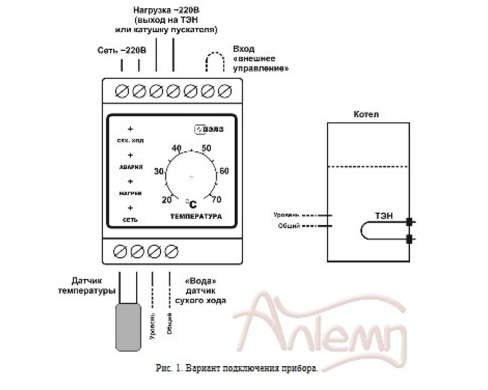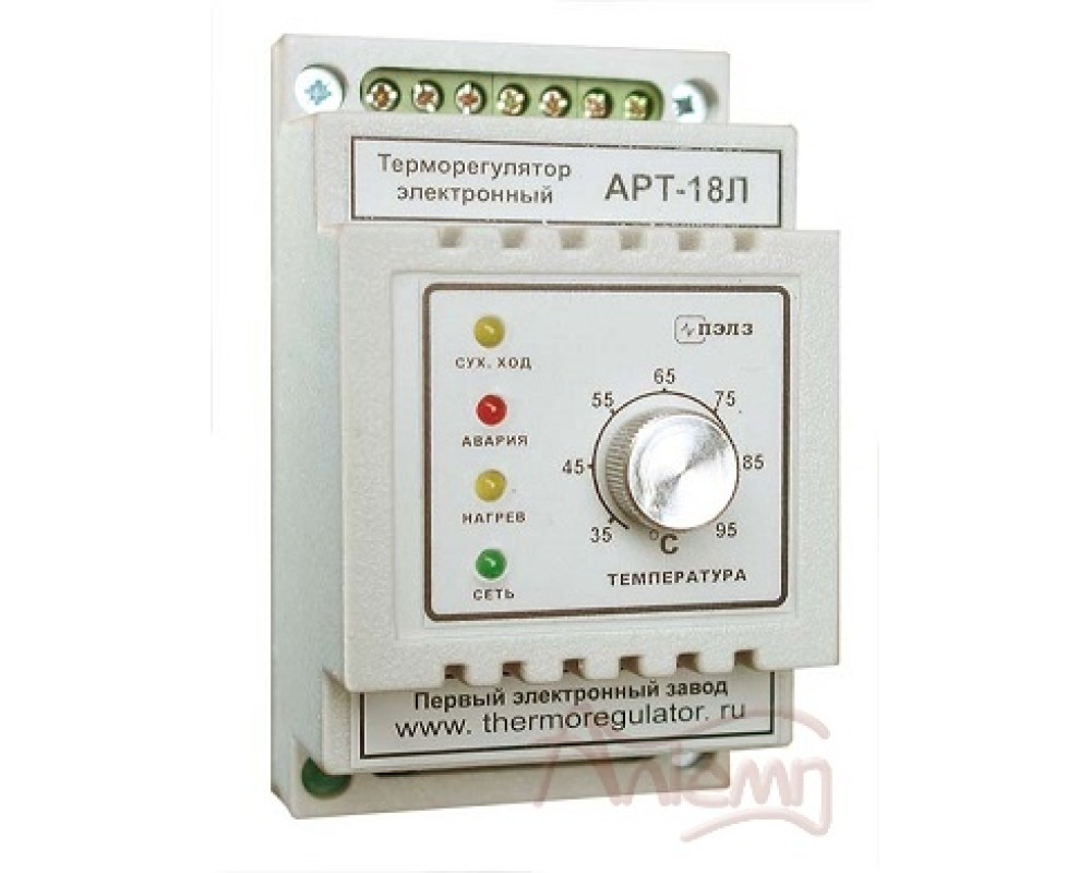 Терморегулятор АРТ-18Л - аналоговый терморегулятор со встроенной системой защиты от сухого хода, имеет клеммы для подключения кондуктометрического датчика воды. При отсутствии воды на контактах датчика прибор отключает нагрузку.
