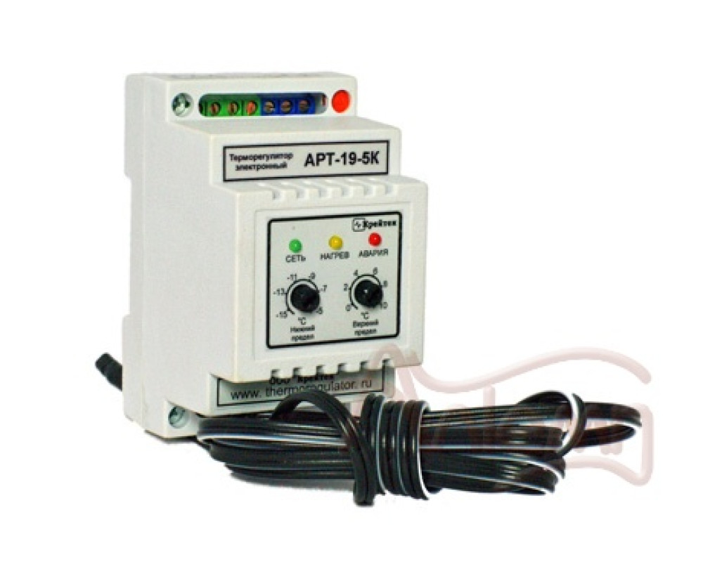 Терморегулятор АРТ-19-5К создан для управления антиобледенительными системами. Он включает нагрузку только внутри заданного диапазона температур. Например, если установить нижнюю границу диапазона -5°С, а верхнюю - +5°С, то нагрев будет включен только, если текущая температура находится в этих пределах, при температуре ниже -5°С и выше +5°С нагрев будет выключен. Поскольку, в разных случаях, границы этого диапазона могут различаться, пользователь может подстраивать их значение, подбирая, таким образом, оптимальный режим работы всей системы.