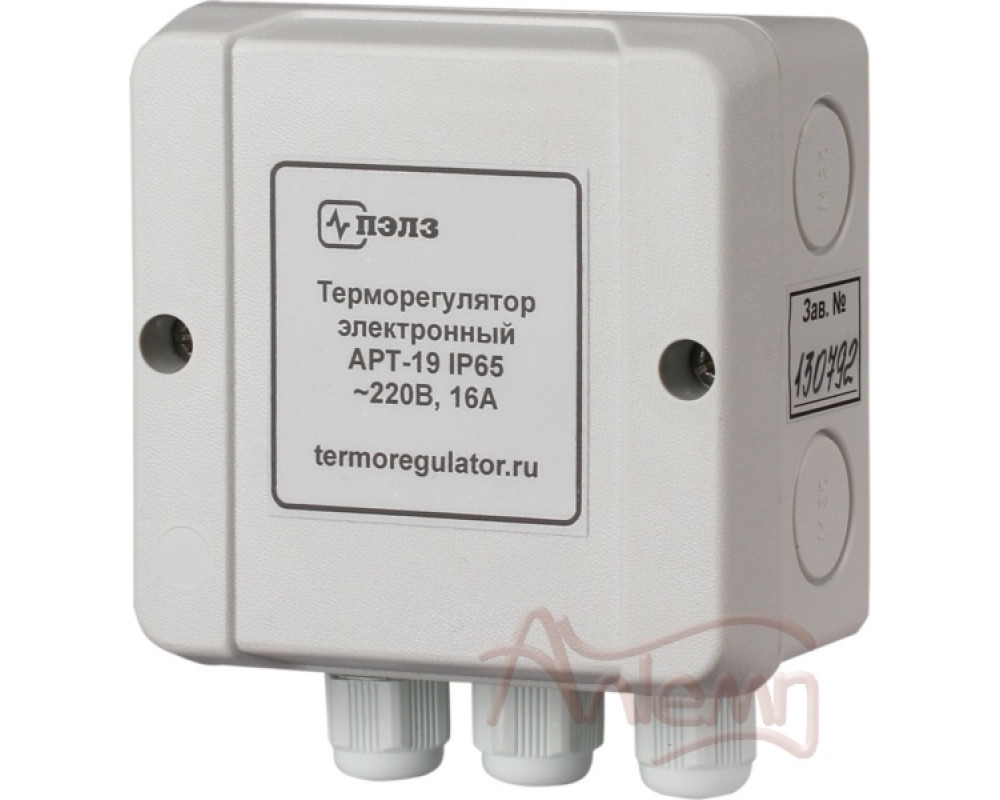 В терморегуляторе АРТ-19 IP65 установлено реле с максимальной нагрузкой на контакты 16А. Мы рекомендует подключать активную нагрузку, например, резистивные ленты ЭНГЛ-1, суммарной мощностью не более 2,5 кВт, а саморегулирующиеся кабели не более 1,5 кВт (пусковые токи таких нагревателей могут превышать номинальные в 2 раза).