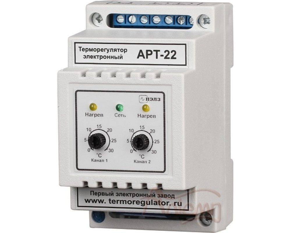 Терморегулятор АРТ-22 фактически представляет собой 2 независимых одноканальных терморегулятора в одном корпусе. Прибор имеет два датчика KTY-81-110 (поставляются в комплекте) и два реле с максимальным током нагрузки 10А (2 кВт). Температура регулируется на каждом из каналов независимо. Диапазон регулировки температуры может быть любым по желанию заказчика (стандартные варианты:0-10, 0-30, 0-60, 0-120) и может различаться на каждом из каналов. Возможно использование данного терморегулятора в одноканальном режиме.