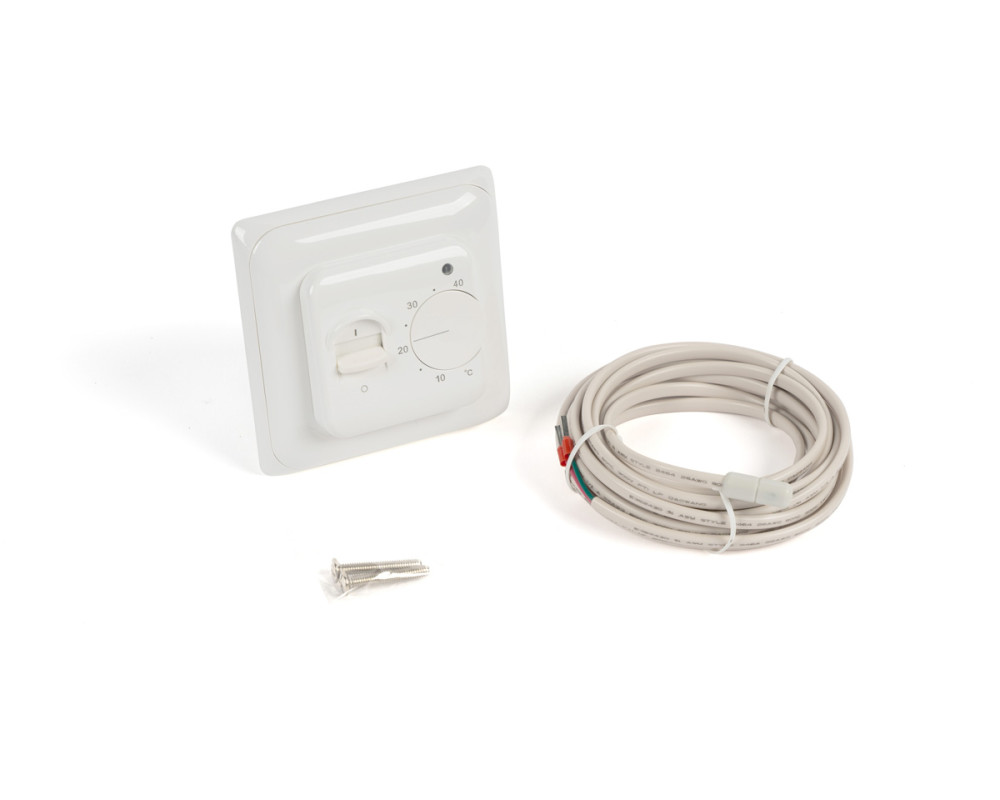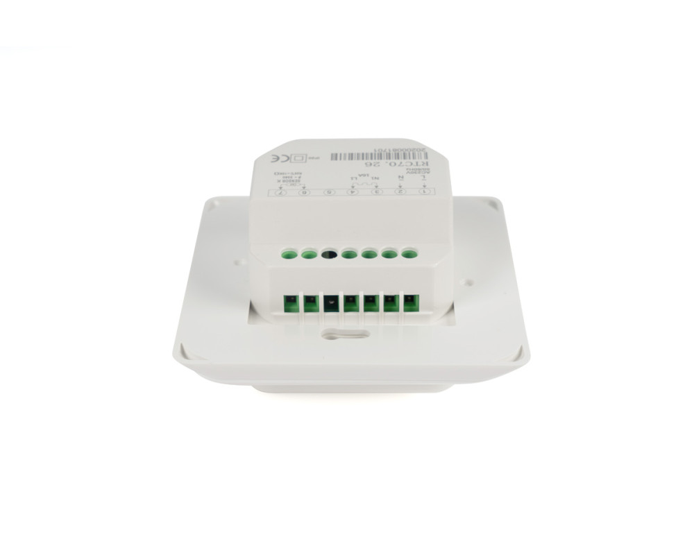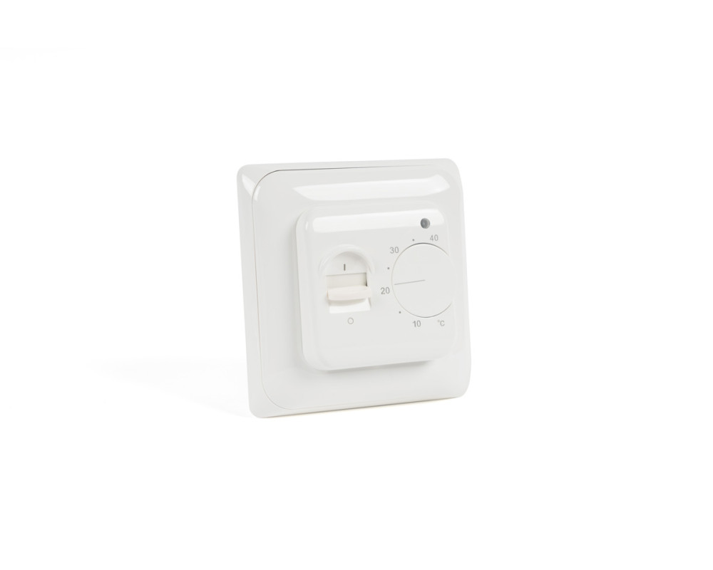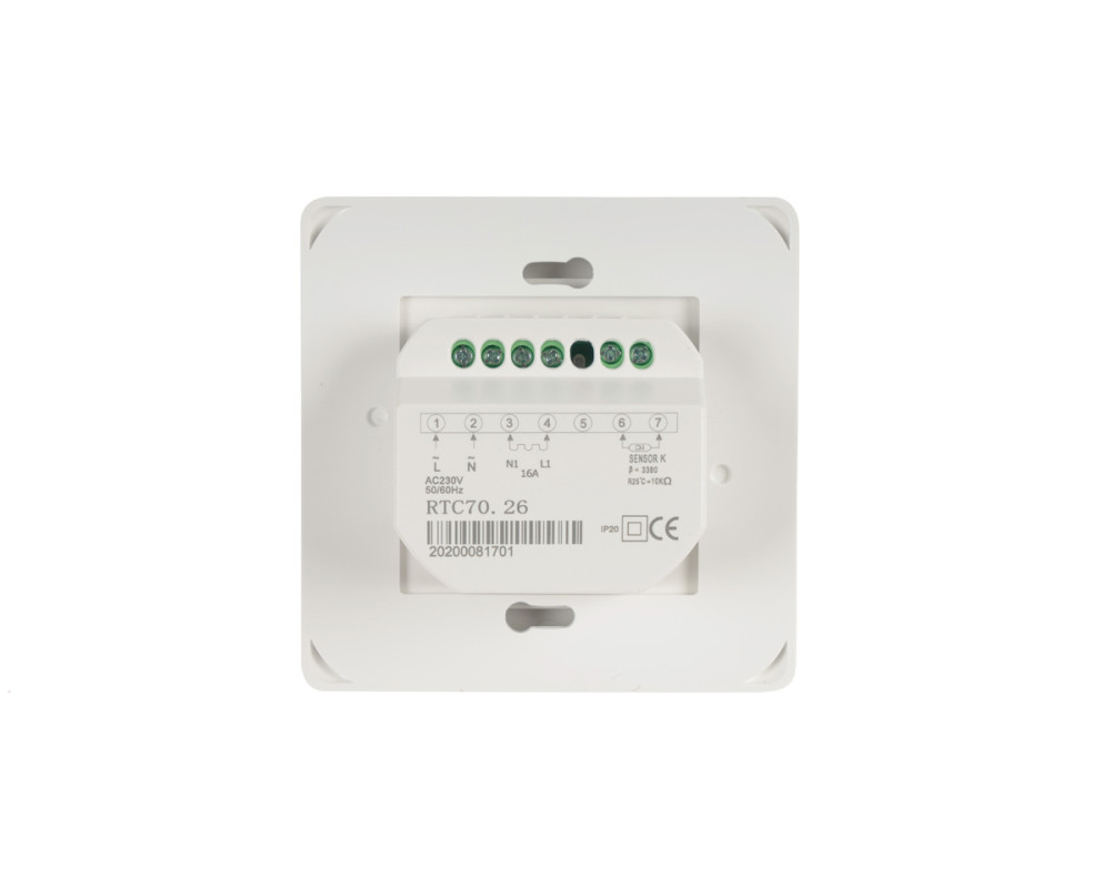 Терморегулятор электронный RTC 70.26 предназначен для автоматического поддержания установленной пользователем температуры теплого пола в пределах от +5°С до +40°С. На передней панели корпуса удобно расположены светодиодный индикатор работы (светодиод загорается при включении нагрева), ручки управления и механический выключатель. Выносной температурный датчик пола (NTC, 10 кОм) размещается непосредственно в полу, температурный датчик может быть установлен на расстоянии до 3 метров от прибора. Терморегулятор монтируется за пределами зоны повышенной влажности, а выносной температурный датчик прекрасно справляется с контролем внутренней температуры помещения, датчик замеряет температуру, передает ее значение на 70.26, который в свою очередь дает команду на включение или отключение теплого пола. Терморегулятор RTC70.26 устанавливается в стандартную монтажную коробку (подрозетник).