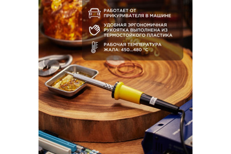 ОписаниеПаяльник со штекером прикуривателя мощностью 40Вт REXANT предназначен для ручного монтажа/демонтажа мелких и средних деталей. Подключается в разъем прикуривателя автомобиля с рабочим напряжением бортовой цепи 12В, что делает процесс пайки более безопасным. Долговечное жало паяльника состоит из медьсодержащего сердечника, покрытого слоем хро..