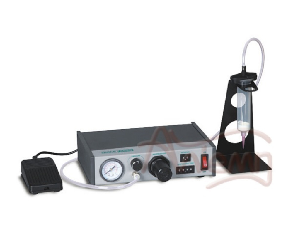 Автоматический дозатор текучих материалов с пневматической подачей, контролируемой таймером, обеспечивает определенный размер выдавливаемых капель путем регулировки времени цикла, давления воздуха и подбора соответствующего наконечника для используемого вами материала (например, клеи, смазки или паяльные пасты).