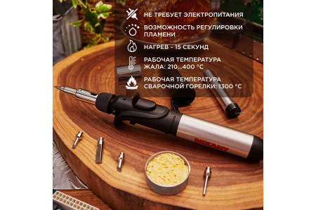 Паяльник-горелка с пьезоподжигом, газовый, 17мл, 6 насадок + припой + губка, коробка REXANT