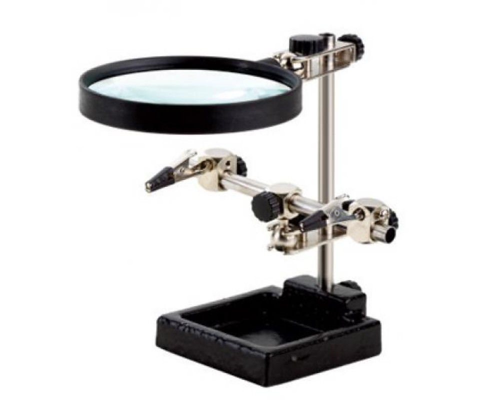 Держатель плат. Два регулируемых зажима типа "крокодил". Зажим на гибкой штанге с длиной 250 мм. Диаметр линзы 90 мм. Увеличение линзы - 3 диоптрии (1,75 крат). Подсветка 16 светодиодов...