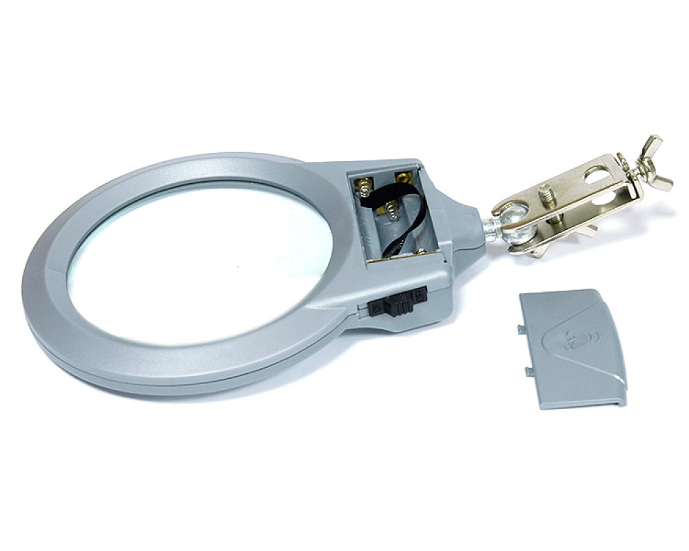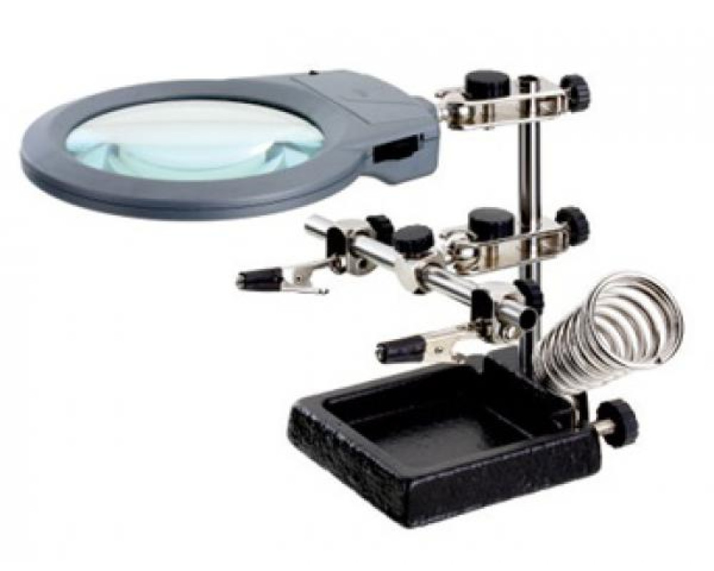 Держатель плат. Два регулируемых зажима типа "крокодил". Зажим на гибкой штанге с длиной 250 мм. Диаметр линзы 90 мм. Увеличение линзы - 3 диоптрии (1,75 крат). Подсветка 16 светодиодов...
