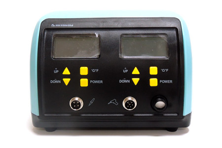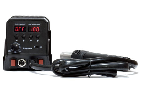 Ремонтная система с термовоздушным каналом и каналом для монтажа. Цифровой дисплей. Максимальная мощность станции - 760 Вт. Индикатор температуры нагрева. Температура нагрева паяльника 200…480 °C, термовоздушный канал 100…450 °С. Воздушный поток 24 л/мин. (макс), насос диафрагменного типа. Антистатическое исполнение. Габаритные размеры: 330х275х195..