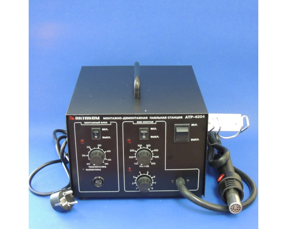 Ремонтная система с термовоздушным каналом и каналом для монтажа. Максимальная мощность станции - 760 Вт. Регулировка температуры каналов с аналоговой шкалой. Индикатор температуры нагрева.Температура нагрева паяльника 200…480 °C, термовоздушный канал 100…450 °С. Воздушный поток 24 л/мин.(макс), насос диафрагменного типа. Антистатическое исполнение..