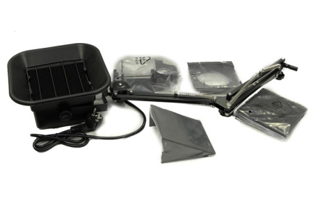 Дымоуловитель с регулируемым углом наклона (пантограф) и угольным фильтром. Механизм крепления: струбцина. Мощность 23 Вт (50/60 Гц), производительность вентилятора 1 куб. м/мин. Низкий уровень шума. Сменные угольные фильтры из полиуретановой пены с высокой абсорбционной способностью. Соответствует требованиям ESD-защиты. Габаритные размеры: 220×23..
