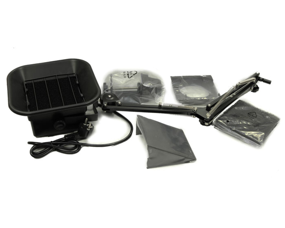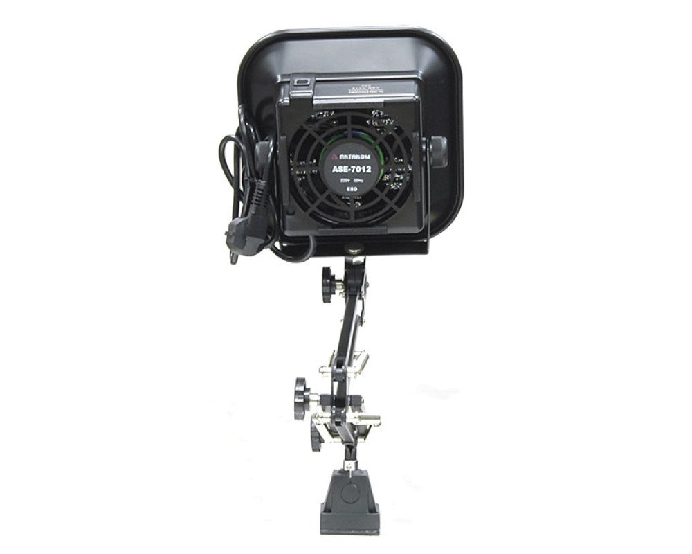 Дымоуловитель с регулируемым углом наклона (пантограф) и угольным фильтром. Механизм крепления: струбцина. Мощность 23 Вт (50/60 Гц), производительность вентилятора 1 куб. м/мин. Низкий уровень шума. Сменные угольные фильтры из полиуретановой пены с высокой абсорбционной способностью. Соответствует требованиям ESD-защиты. Габаритные размеры: 220×230×500 мм. Вес 2,6 кг.