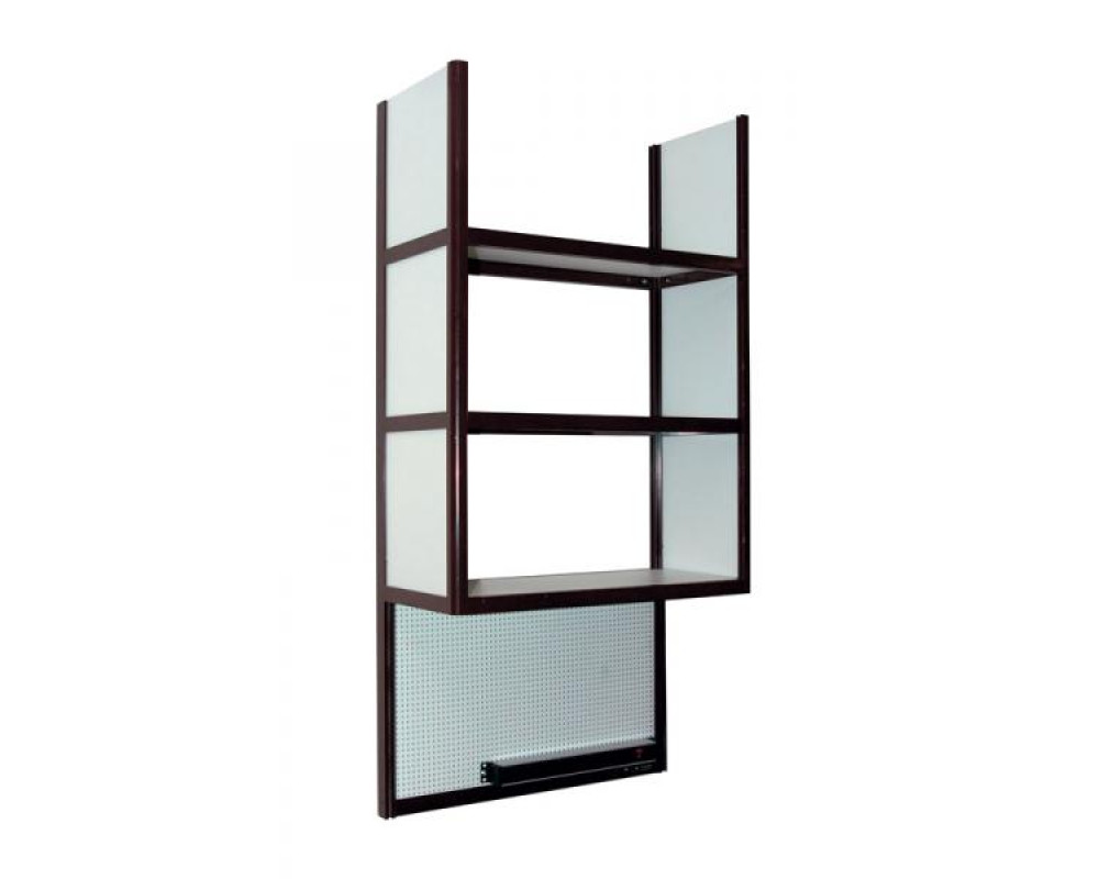 Полка навесная для организации рабочего места над столом. Габаритные размеры(ВхГхШ): 1000х300х750. Три уровня полок (ш х г) 690 х 300 мм, регулируемые по уровню. Внизу полки перфорированный лист (ш х г) 690 х 500мм для навески крючков для инструмента, а также три клеммы заземления. Оснащена блоком розеток АТР-9108.Цвет ДСП-белый, цвет алюминиевого каркаса - коричневый.