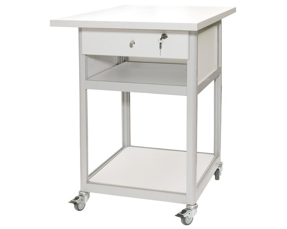 Стол подкатной с ящиком. Столешница в ESD исполнении размером 72,3х50 см из антистатического меламинированного ДСП толщиной 25 мм. Цвет алюминиевого каркаса - серый (RAL-9006), цвет ДСП - белый. Выдвижной ящик, две полки 40х40 см, четыре колеса, два из них блокируемые. Габаритные размеры 50х72х75 см...
