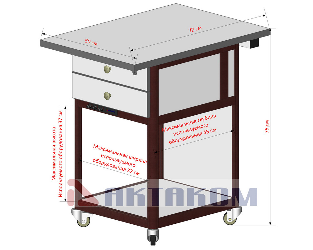 Стол подкатной 50х72х75 см. Цвет алюминиевого каркаса - коричневый (RAL-8017), цвет ДСП - белый. Четыре колеса, два из них блокируемые. Две полки 40х40 см...
