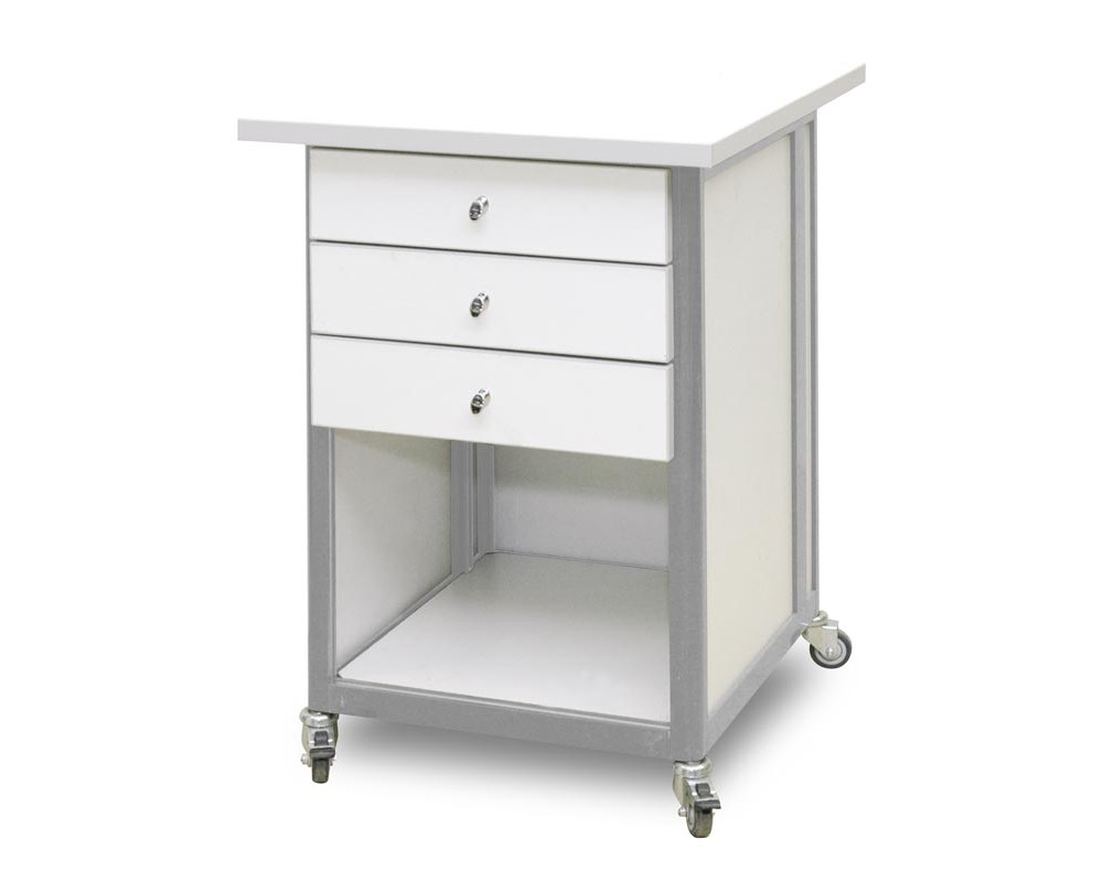 Стол подкатной 50 × 72 × 75 см. Два выдвижных ящика, верхний ящик - запирающийся на замок, одна полка 43 × 47 см, четыре колеса, два из них блокируемые. Снизу столик закрыт задней стенкой из ДСП, на которой установлен блок розеток АТР-9106. На переднем алюминиевом профиле закреплены 3 разъема заземления АРМ-9407...