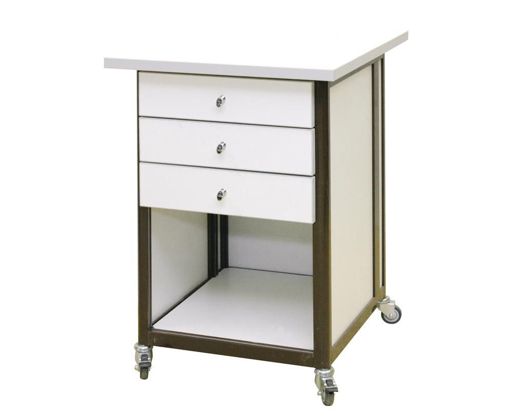 Стол подкатной 50 × 72 × 75 см. Два выдвижных ящика, верхний ящик - запирающийся на замок, одна полка 43 × 47 см, четыре колеса, два из них блокируемые. Снизу столик закрыт задней стенкой из ДСП, на которой установлен блок розеток АТР-9106. На переднем алюминиевом профиле закреплены 3 разъема заземления АРМ-9407...