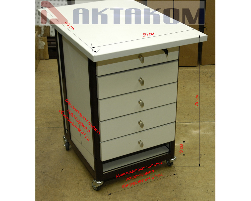 Стол подкатной 50 × 72 × 75 см. Два выдвижных ящика, верхний ящик - запирающийся на замок, одна полка 43 × 47 см, четыре колеса, два из них блокируемые. Снизу столик закрыт задней стенкой из ДСП, на которой установлен блок розеток АТР-9106. На переднем алюминиевом профиле закреплены 3 разъема заземления АРМ-9407...