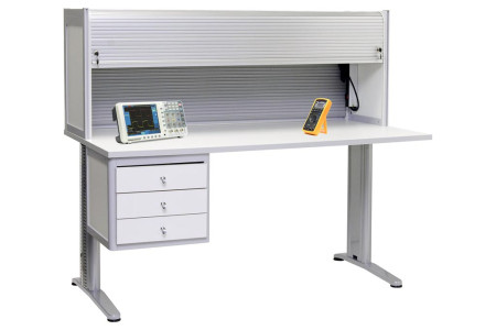 Стол-бюро с антистатической столешницей. Цвет алюминиевого каркаса - серый (RAL-9006), цвет ДСП - белый. Подвижная система жалюзей с двумя замками. Столешница размером 100х80 см из антистатического меламинированного ДСП толщиной 25 мм. Разъемы заземления. Освещение: светодиодный светильник 10 Вт. Блок из 6 розеток с выключателем. Высота изделия 131..