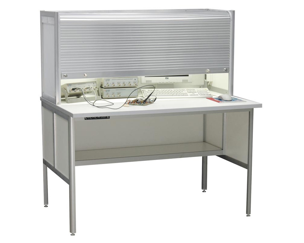 Стол-бюро с антистатической столешницей. Цвет алюминиевого каркаса - серый (RAL-9006), цвет ДСП - белый. Подвижная система жалюзей с двумя замками. Столешница размером 100х80 см из антистатического меламинированного ДСП толщиной 25 мм. Разъемы заземления. Освещение: светодиодный светильник 10 Вт. Блок из 6 розеток с выключателем. Высота изделия 131..