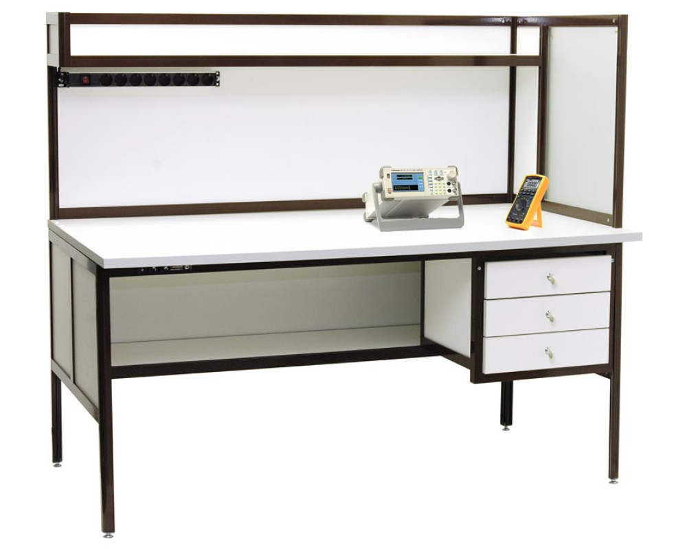 Стол инженера/менеджера с перегородкой и с антистатической столешницей 150х80х134 см. Цвет алюминиевого каркаса - коричневый (RAL-8017), цвет ДСП - белый. Столешница размером 150х80 см из антистатического меламинированного ДСП толщиной 25 мм. Полка 150х30 см под столешницей. Перегородка угловая 60 см, с полкой. Освещение: 2 светодиодных светильника..