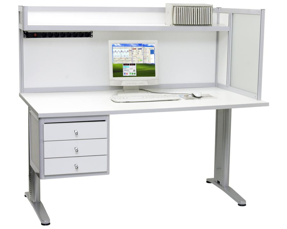 Стол инженера/менеджера c антистатической столешницей. Цвет алюминиевого каркаса - серый (RAL-9006), цвет ДСП - белый. Столешница размером 150х80 см из антистатического меламинированного ДСП толщиной 25 мм. Перегородка высотой 60 см правосторонняя (левосторонняя - по заказу). Одна полка 150x20 см над столешницей. Освещение из 2-х светодиодных свети..