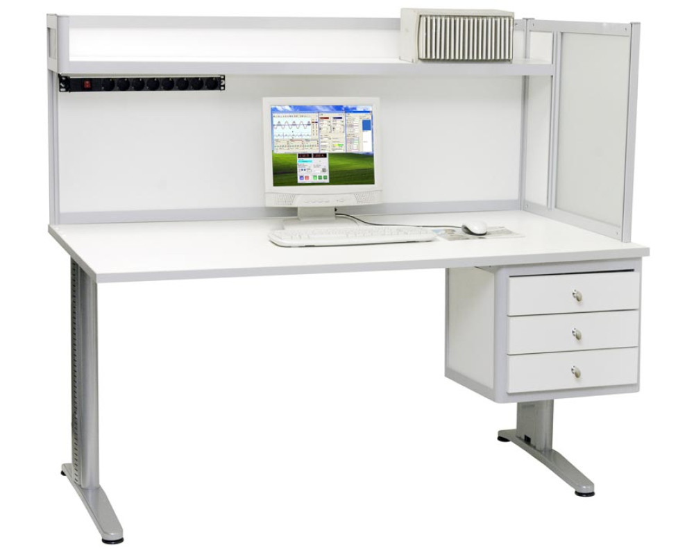 Стол инженера/менеджера c антистатической столешницей. Цвет алюминиевого каркаса - серый (RAL-9006), цвет ДСП - белый. Столешница размером 100х80 см из антистатического меламинированного ДСП толщиной 25 мм. Перегородка высотой 60 см правосторонняя (левосторонняя - по заказу). Одна полка 100x20 см над столешницей. Освещение: светодиодный светильник ..
