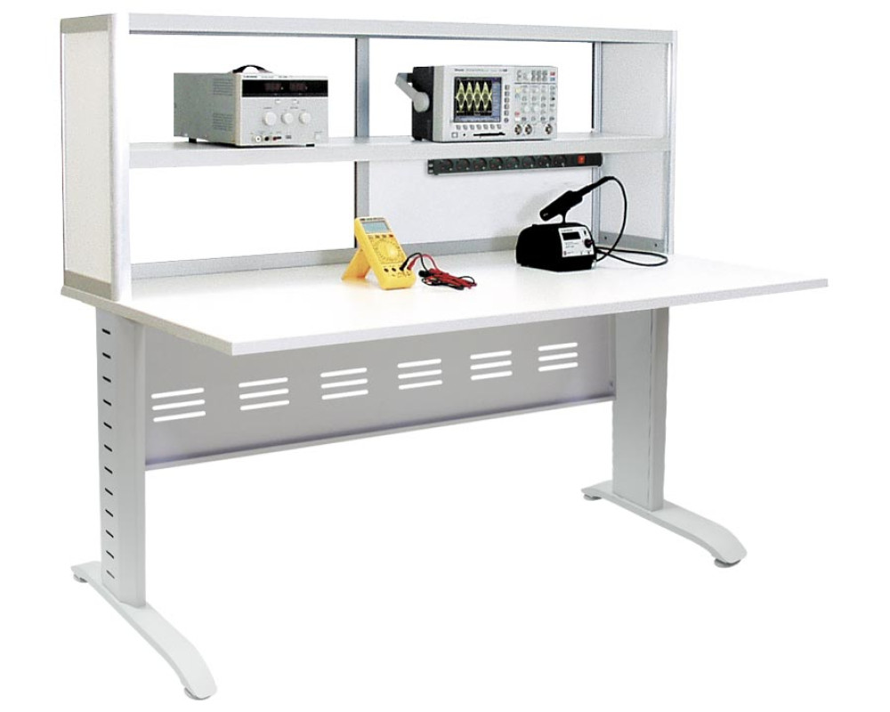 Стол метролога. Цвет алюминиевого каркаса - серый (RAL-9006), цвет ДСП - белый. Столешница 150 x 80 см. Две полки 150 x 30 см без задней стенки над столешницей. Разъемы заземления. Блок из 8 розеток с выключателем. Высота 131 см...