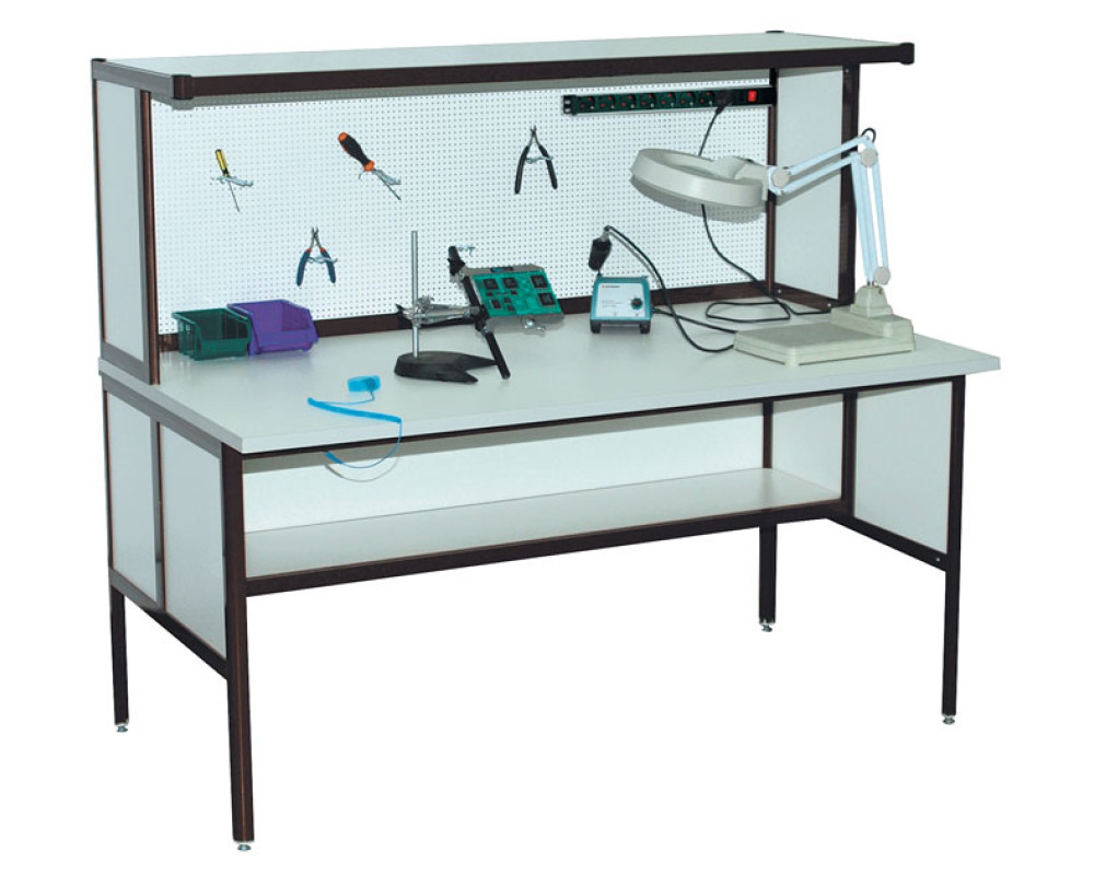 Стол монтажника радиоаппаратуры с антистатической столешницей 150х80х131 см. Цвет алюминиевого каркаса - коричневый (RAL-8017), цвет ДСП - белый. Столешница размером 150х80 см из антистатического меламинированного ДСП толщиной 25 мм. Полка 150х50 см над столешницей, полка 150х30 см с задней стенкой под столешницей. Освещение: 2 светодиодных светиль..