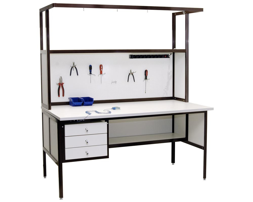 Стол слесаря-сборщика радиоаппаратуры с антистатической столешницей 100х80х171 см. Цвет алюминиевого каркаса - коричневый (RAL-8017), цвет ДСП - белый. Столешница размером 100х80 см из антистатического меламинированного ДСП толщиной 25 мм. Одна полка 100х30 см над столешницей. Одна полка 100х30 см над столешницей. Одна полка 100х30 см с задней стен..