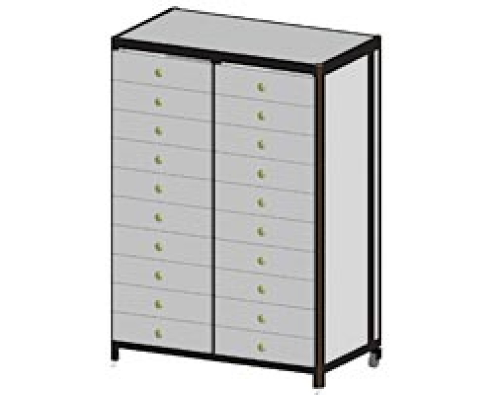 Стойка комплектовочная 90 х 50 х 202 см. Цвет алюминиевого каркаса - коричневый (RAL-8017), цвет ДСП - белый. 30 ящиков 33 x 40 x 8 см в два ряда. 2 дверцы из полупрозрачного стекла с замком. Полка 84 x 44 см с раздвижными дверцами из оргстекла. 4 колеса, 4 винтовые ножки...