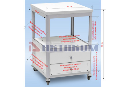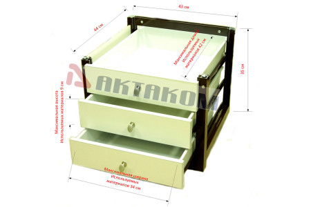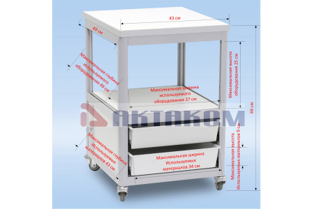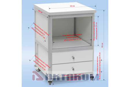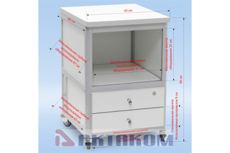 Тумбочка подкатная с двумя ящиками и полкой. Цвет алюминиевого каркаса – коричневый (8017), цвет ДСП - белый. Два выдвижных ящика с лицевыми панелями, одна полка 40х40 см, четыре колеса, два из них блокируемые. Стенок вокруг полки нет. Габариты 43х50х66 см...