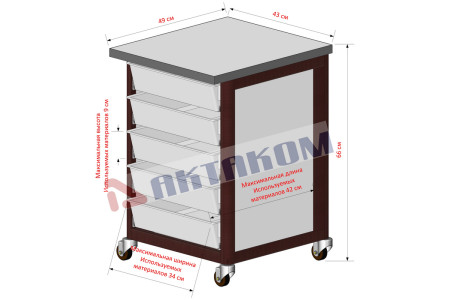 Тумбочка подкатная 43х50х65,5 см. Цвет алюминиевого каркаса - коричневый (RAL-8017), цвет ДСП - белый. Четыре колеса без блокировки. Пять ящиков 33х40х8 см, с лицевыми панелями...