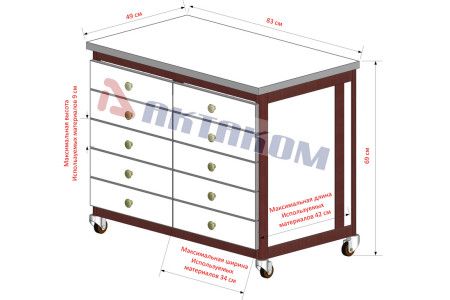Тумбочка подкатная (шхгхв) 84х50х69 см. Цвет алюминиевого каркаса - коричневый (RAL-8017), цвет ДСП - белый. Четыре колеса на резиновом ходу без блокировки. Десять ящиков 33х40х8 см, с лицевыми панелями...