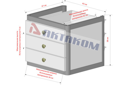 Тумбочка подкатная с двумя ящиками и полкой. Цвет алюминиевого каркаса – коричневый (8017), цвет ДСП - белый. Два выдвижных ящика с лицевыми панелями, один с замком, одна полка 40х40 см, четыре колеса, два из них блокируемые. Стенка вокруг полки. Габариты 43х50х66 см...