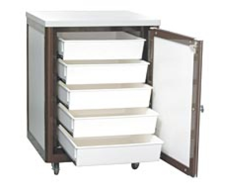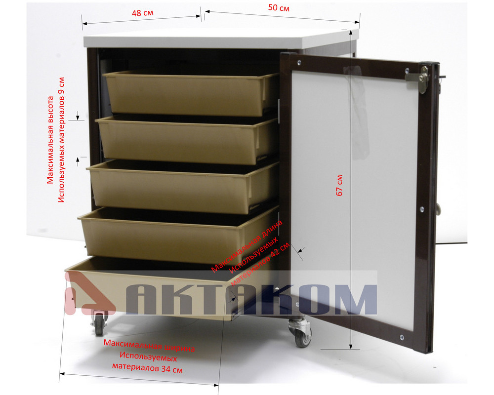 Тумбочка подкатная 43х50х65,5 см. Цвет алюминиевого каркаса - коричневый (RAL-8017), цвет ДСП - белый. Четыре колеса без блокировки. Пять ящиков 33х40х8 см, с лицевыми панелями...
