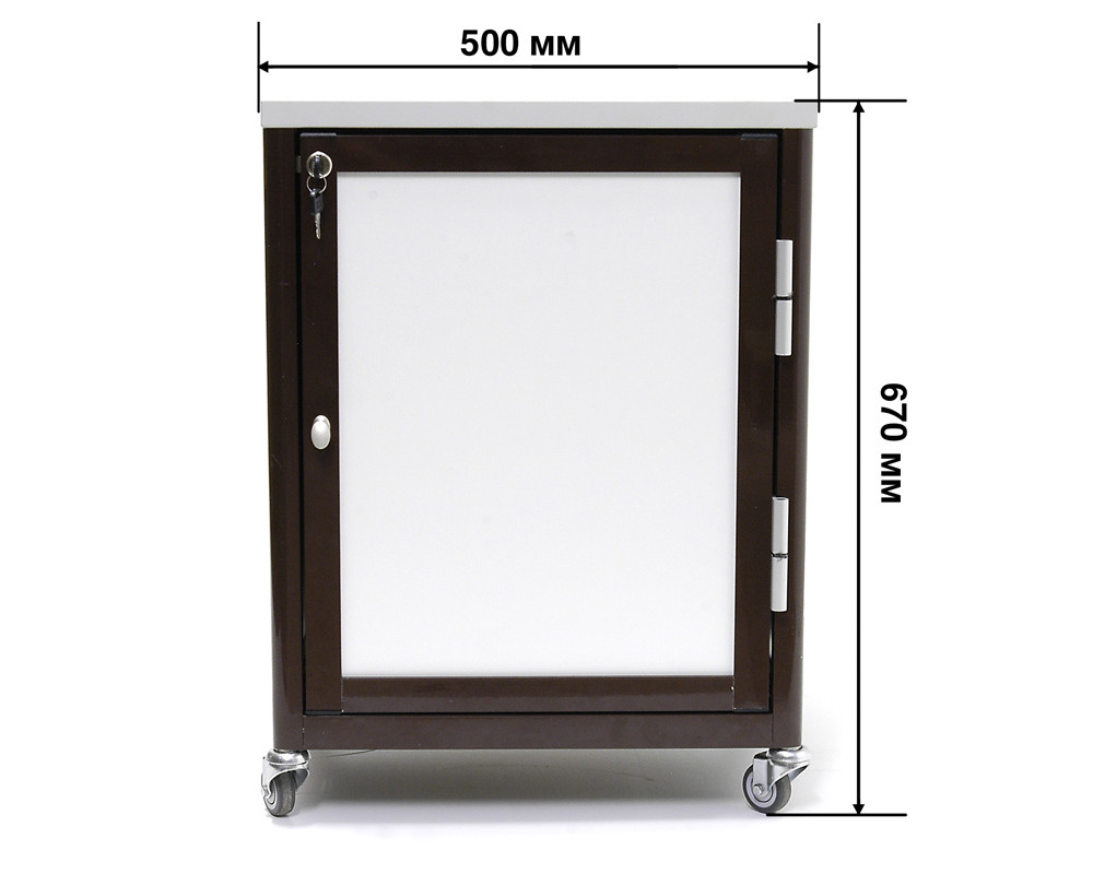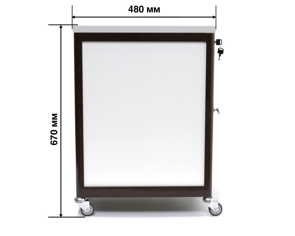 Тумбочка подкатная с двумя ящиками и полкой. Цвет алюминиевого каркаса – коричневый (8017), цвет ДСП - белый. Два выдвижных ящика с лицевыми панелями, один с замком, одна полка 40х40 см, четыре колеса, два из них блокируемые. Стенок вокруг полки нет. Габариты 43х50х66 см...