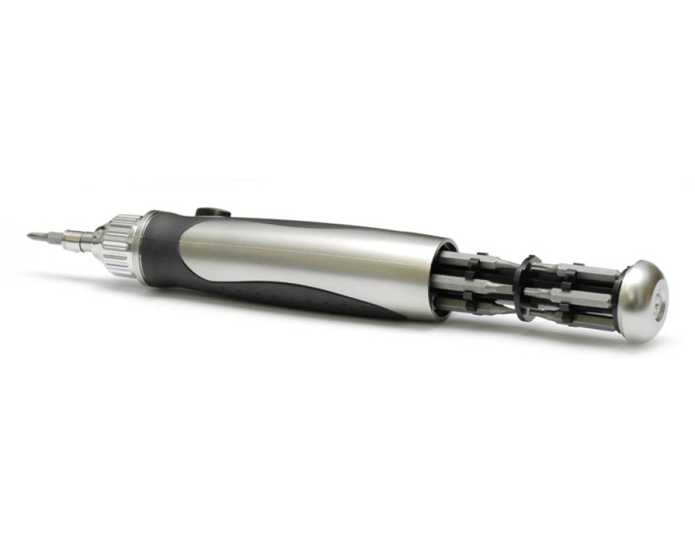 Отвёртка c храповым механизмом и сменными насадками (M4 - 7х25 мм): прямой шлиц; крестовые Phillips; шестигранник; звёзда Torx. Мини-отвёртка с двумя двухсторонними прецизионными насадки (M2 - 4х25 мм): SL2,0/PH00; SL1,5/PH0 и отделением для хранения насадок. Укороченная ручка для работы в труднодоступных местах. Усиленная ручка с отсеком для хране..