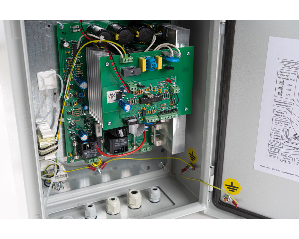 24 В, 12 А; Модуль визуализации и корректор мощности; Диапазон сети — 90–260 В; Термокомпенсация заряда АКБ; Защита от КЗ в нагрузке; Защита устройства и нагрузки от неправильного подключения АКБ; Контроль наличия АКБ; Защита АКБ от глубокого разряда и КЗ; 5 информационных выходов (реле); Регулировка тока заряда АКБ; Холодный запуск; Контроль ёмкос..