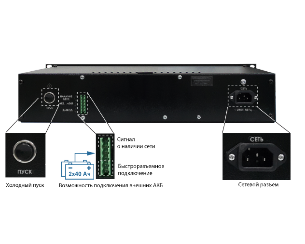 12 В, 4 А; Встроенная Li-ion АКБ 7 Ач, 12 В в комплекте; Время работы от АКБ на максимальной нагрузке — 1,2 часа; Соответствует ФЗ 123 и ГОСТ Р 53325-2012; Стабильное время резерва и длительный срок службы АКБ; Защита АКБ от разряда и КЗ в нагрузке; Электронная защита выхода от КЗ; Выключатель АКБ; Холодный пуск; Собственное потребление — менее 40..