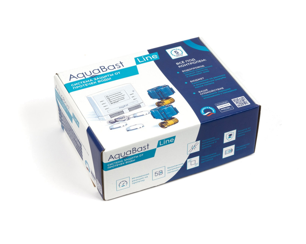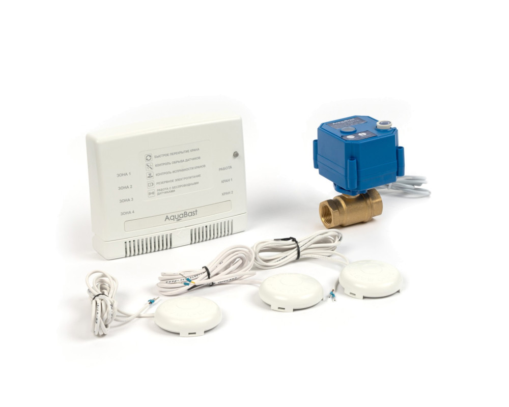 В комплект входит: контроллер защиты от протечек воды AquaBast C-RF. 1 шаровой кран с электроприводом, 12 В. 1 дюйм, корпус латунь литье, ручное открытие / закрытие, индикатор положения крана. 3 проводных датчика протечки, 1 блок питания на 5В. Система обеспечивает: контроль датчиков протечки и выдачу управляющих сигналов на перекрытие шаровых кранов в случае аварии (4 зоны контроля). Управление одной кнопкой, светодиодная индикация режимов работы и зон протечки энергосберегающий режим при работе от АКБ, звуковое и световое оповещение о протечке и авариях периферийных устройств.