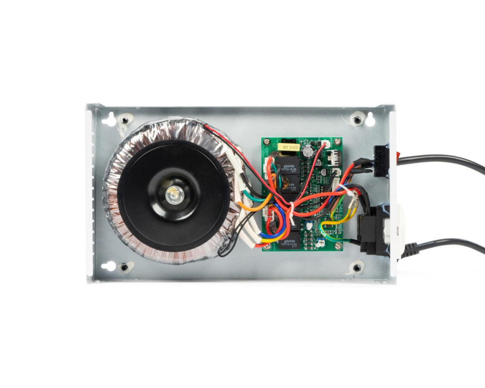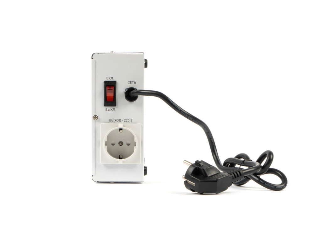 Релейный стабилизатор напряжения; Мощность нагрузки: до 3 кВА; Диапазон входного напряжения: 100 – 260 В; 6 ступеней регулирования; Точность стабилизации — 8%..