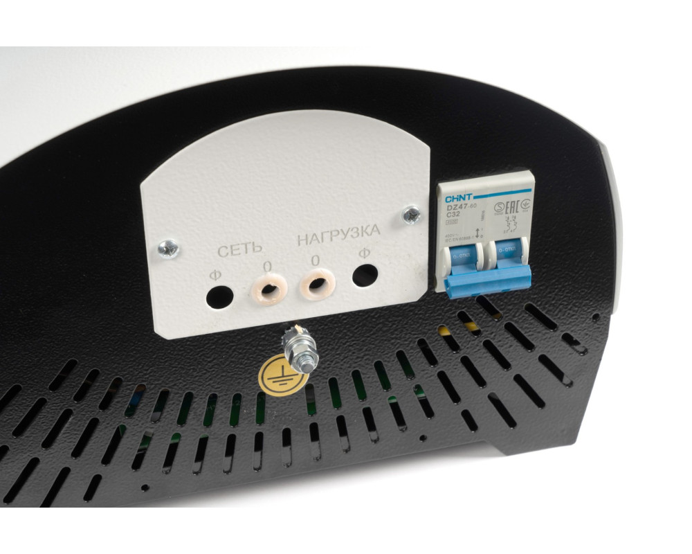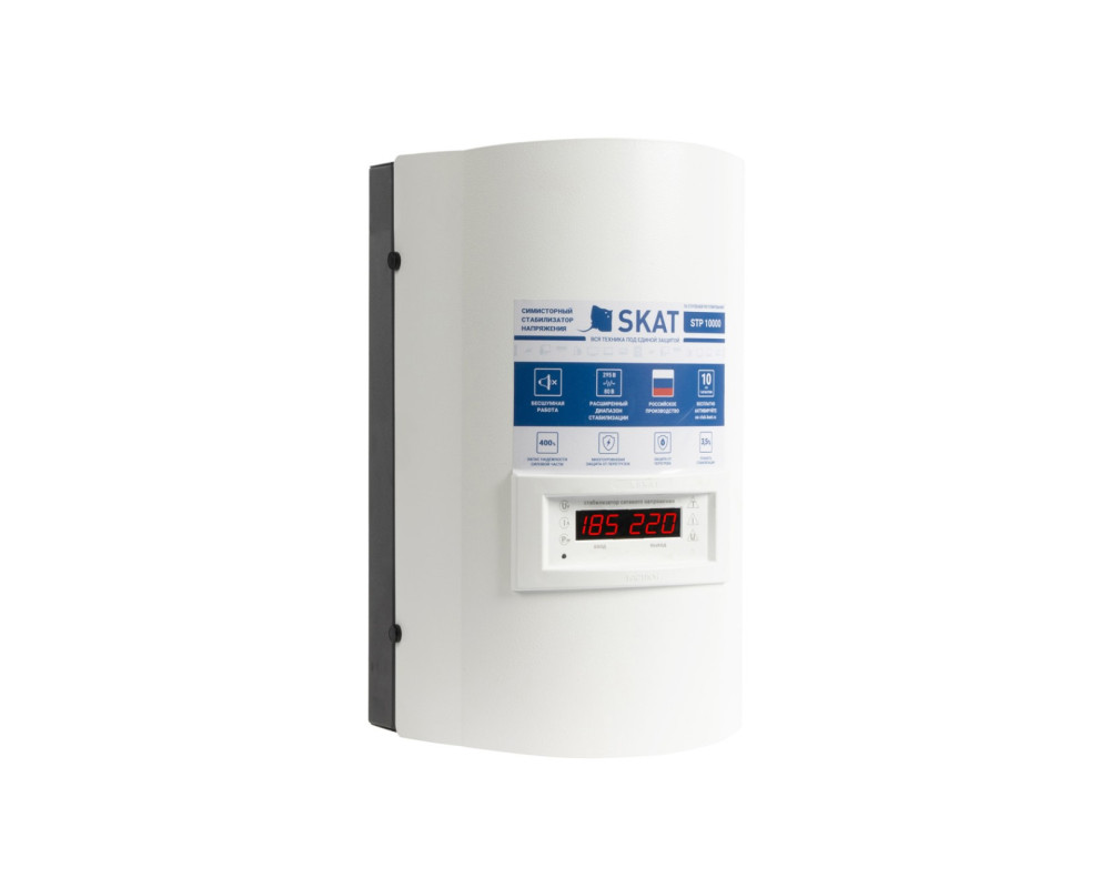 Бесшумный симисторный стабилизатор напряжения для всего дома. Мощность нагрузки — до 10 кВА. 9 ступеней регулирования. Точность стабилизации — 7%. Рабочий диапазон напряжения сети — 120...280 В. Расширенный диапазон напряжение сети — 80...295 В. 4 температурных датчика для защиты от перегрева. Тройная защита от перегрузки. Микропроцессорное управление и «мягкое» переключение ступеней. Стабилизация вольтдобавочного типа. Цифровой дисплей отображает реальное напряжение, ток, мощность по входу и выходу. Конвективное охлаждение без вентилятора. Защитное отключение при аварийно низком/высоком напряжении с автоматическим восстановлением.